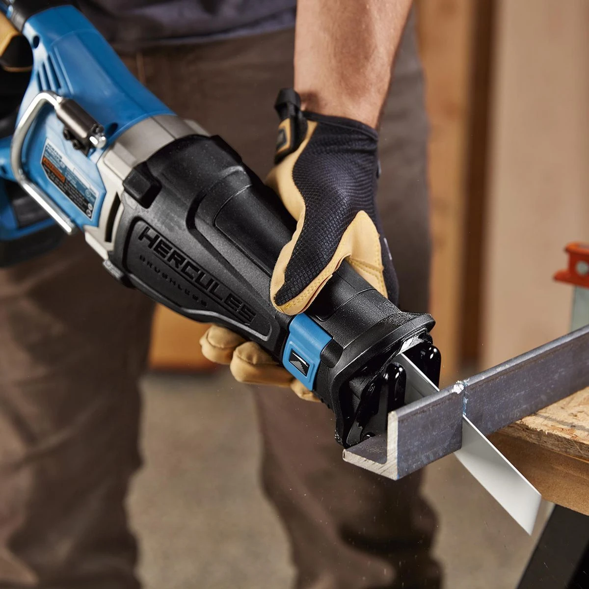 The HERCULESยฎ 20V Brushless Cordless Reciprocating Saw cuts faster than corded and uses brushless technology for up to 45% more run time*. A pivoting shoe with 3 position depth adjustment provides ultimate cutting control in a wide variety of materials. The keyless single-action quick-change blade mechanism cuts downtime on the job. Integrated electric brake quickly stops the blade when the trigger is released, making it easier to move from one cut to the next. This saw comes with a HERCULESยฎ professional 6 in. 14TPI saw blade. Buy with confidence with an included no-questions-asked risk-free trial, with additional coverage up to 2 years.