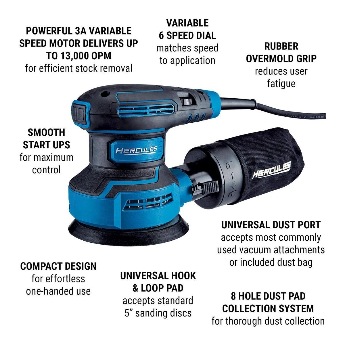 Brand new 🔔 HERCULES 3 Amp 5 in. Random Orbital Palm Sander with Soft Start ⌛ -Outlet The Power Tool Hub Store 56458 W3