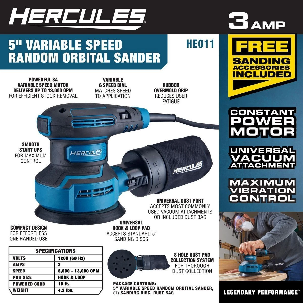 The HERCULES® Professional 5 in. Corded Random Orbital Palm Sander is engineered to deliver Legendary Performance in your shop or on the jobsite. A powerful 3 A motor delivers up to 13,000 OPM for efficient stock. A variable 6 speed dial makes it easy to precisely match speed to application. Maximum Vibration Control makes this sander more comfortable and easier to use on big projects. Eight hole through-the-pad dust collection works with the included dust bag or the universal collector port that connects with most commonly used vacuum attachments. The 5 in. pad accepts standard hook-and-loop sanding discs.