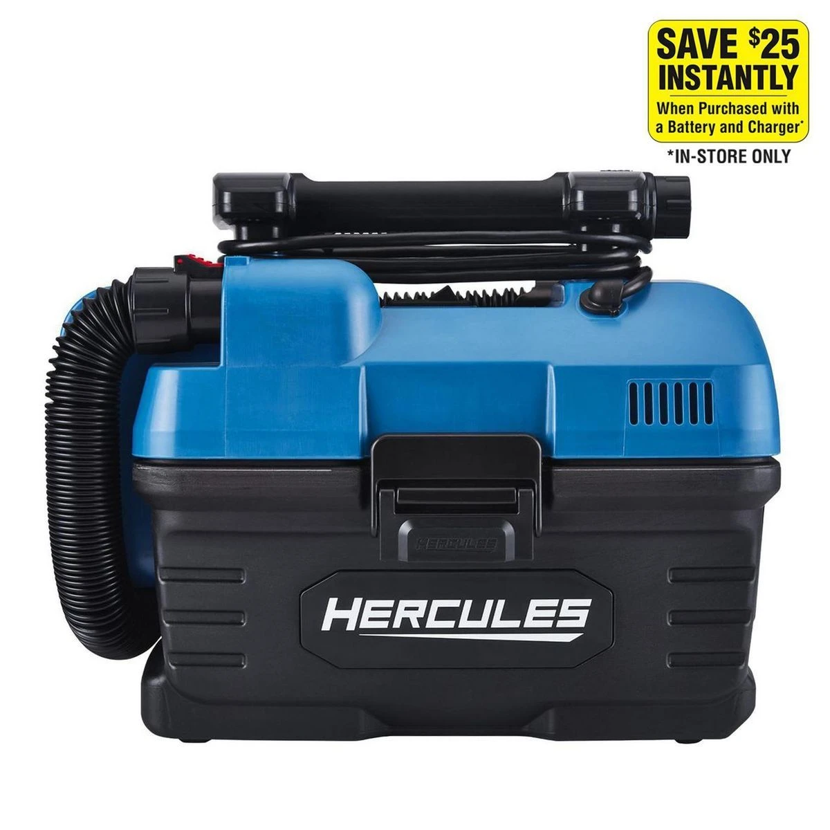 The HERCULES™ 20V/120V Dual Power 2 Gallon Wet/Dry Portable Vacuum is easy to handle for fast cleanup of dust, dirt and debris. Get ultimate portability along with full power and long run times using the HERCULES™ Lithium battery system or switch to 120V for prolonged use. This vacuum has a HEPA wet/dry filter that traps 99.97% of dust at 1 micron and easily washes clean with water. A blower port makes it easy to use the vacuum as a blower to sweep away loose dust and debris. Combined with the HERCULES™ Lithium battery system for fast charging and longer run times, this tool delivers legendary performance that professionals demand.