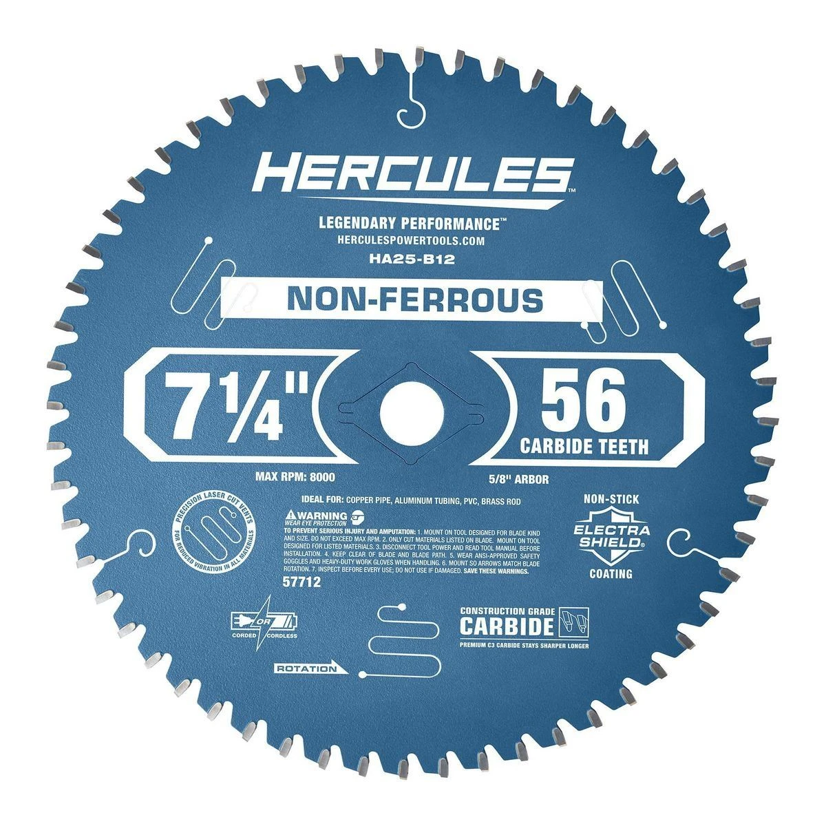 This HERCULES™ 7-1/4 in., 56T Non-Ferrous Circular Blade is specially engineered for cutting copper, aluminum, brass, fiberglass, PVC, and laminate. Precision laser-cut vents reduce vibration for smoother, more accurate cutting. The non-stick Electra-Shield® coating prevents sticking, gumming and burning.