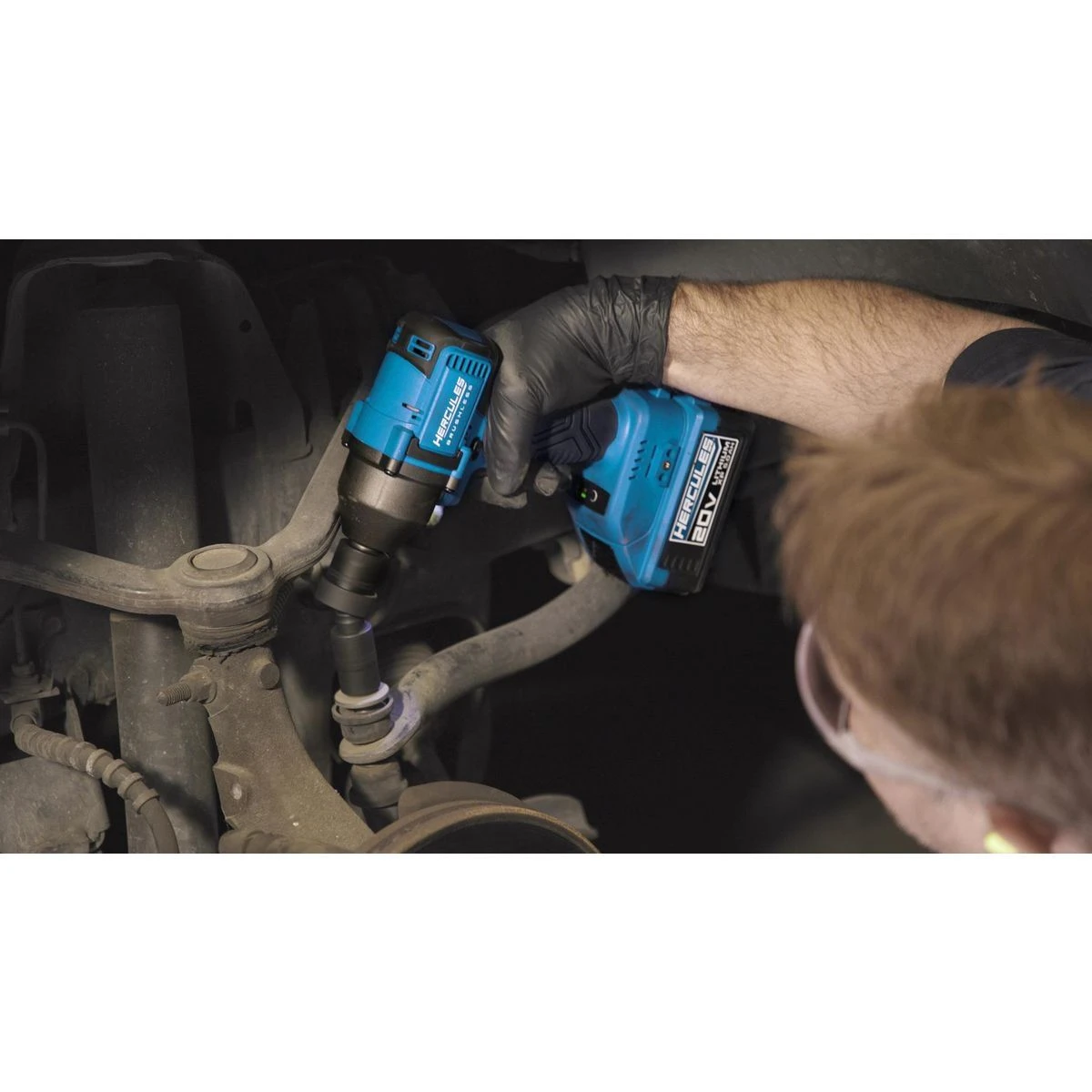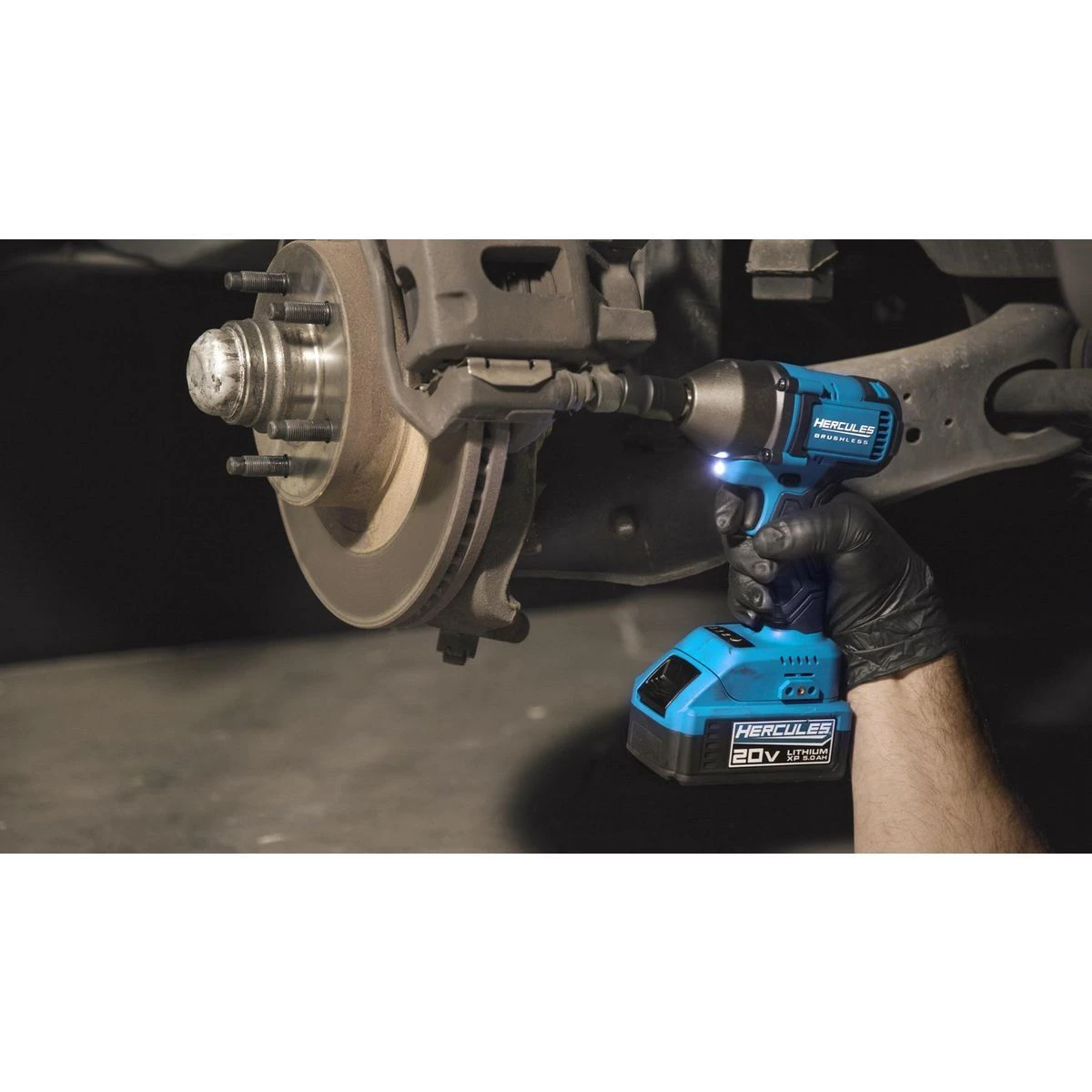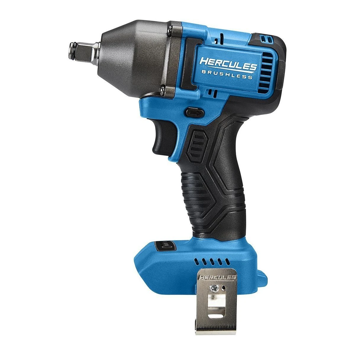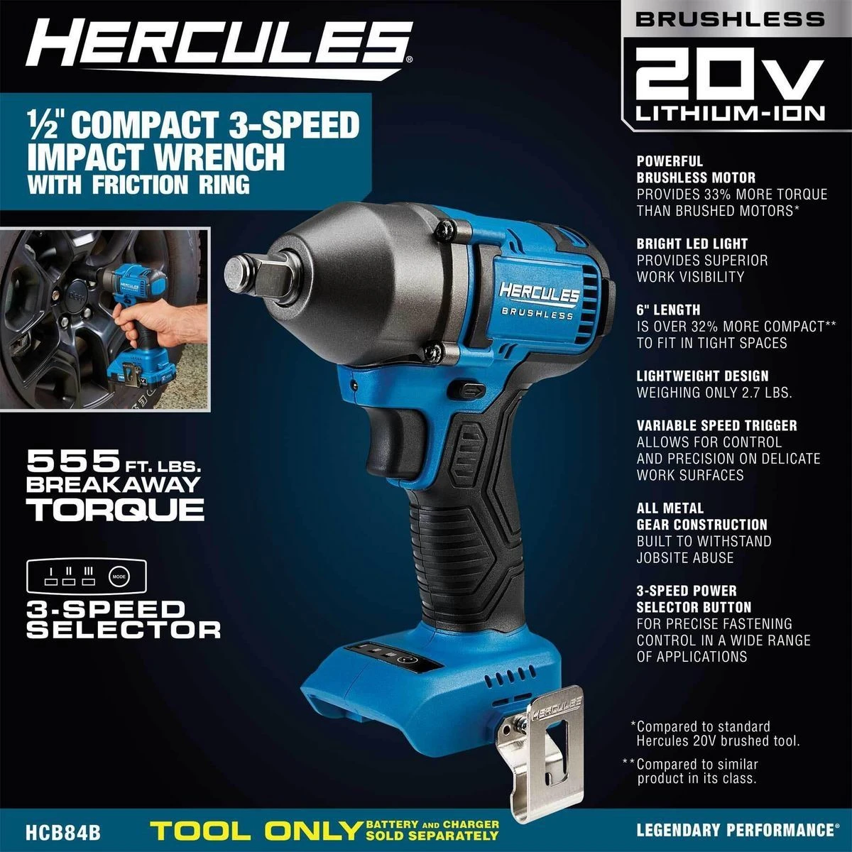 The HERCULESยฎ 20V Brushless Cordless 1/2 in. Compact 3-Speed Impact Wrench delivers up to 555 ft. lbs. of bolt breakaway torque. This tool is equipped with a 3-speed selector that operates at 0-1000/0-1700/0-2000 RPM to power-off nuts and bolts quickly and accurately. A built-in LED light provides superior work visibility. Pair up with the HERCULESยฎ 5.0 Amp Hour battery pack to deliver more work per charge and more work over the life of the pack.