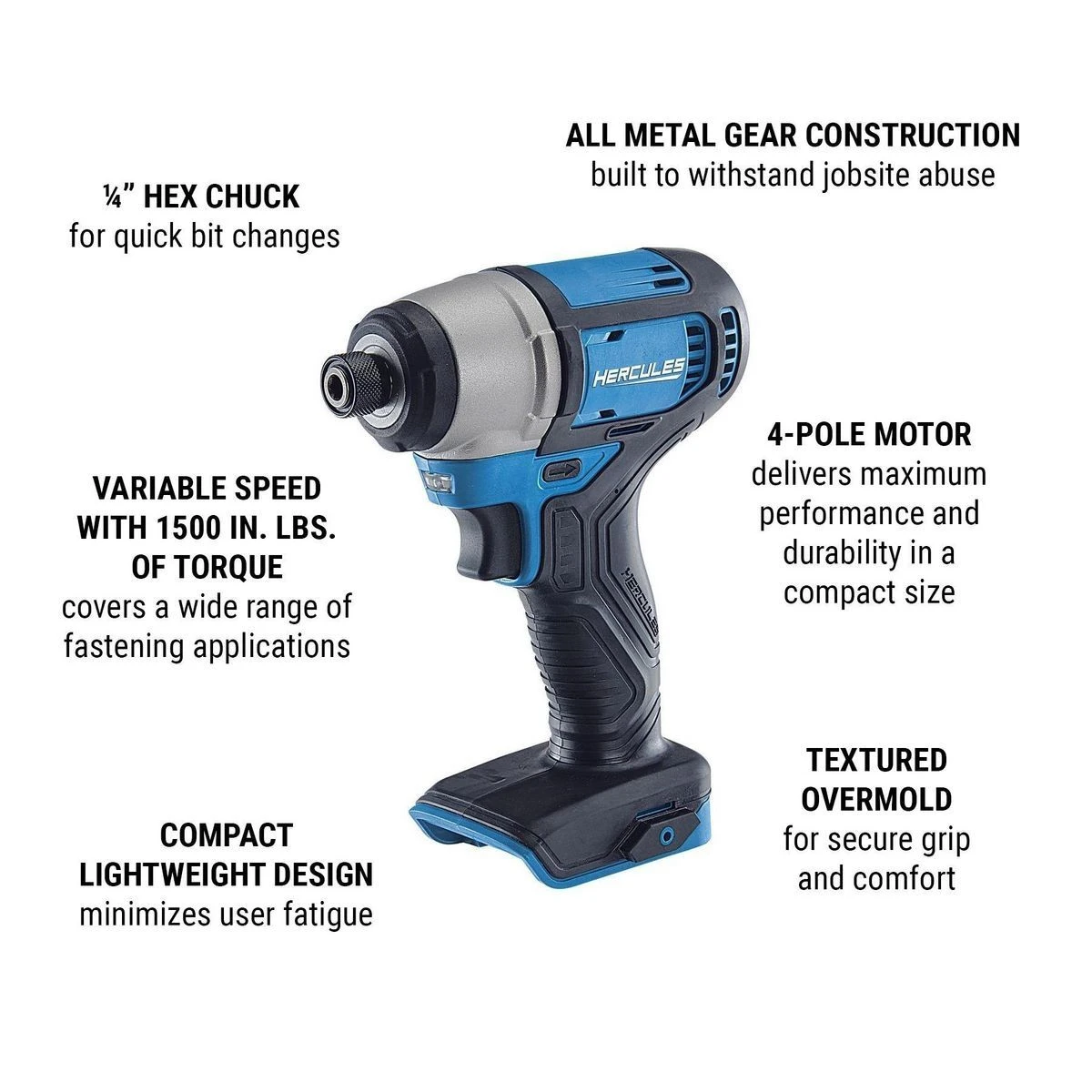 The jobsite tough 20V HERCULESยฎ cordless compact 1/4 in. hex impact driver produces 1500 in. lbs. of torque and 0-3200 IPM to handle a wide range of fastening applications including work on decking, fencing, or drywall. A built-in LED light with delay after trigger release gives you a clear view in dark spaces. Combined with the HERCULESยฎ lithium-ion battery system for fast charging and longer run times this tool delivers legendary performance. Buy with confidence with an included no-questions-asked risk-free trial, with additional coverage up to 2 years.