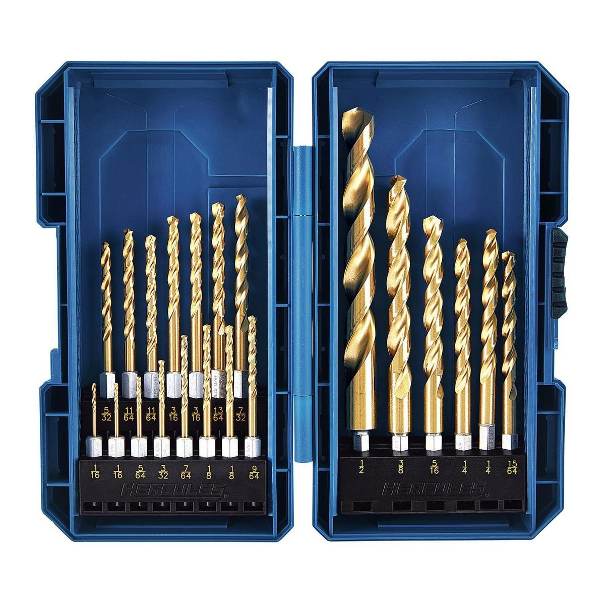 Get up to 4x more life* from HERCULESโข drill bits with BlueBraidโข titanium coating. Drill clean straight holes every time with the StarterPointโข angle tips. Packed in a rugged high-impact heavy duty case that makes bit selection easy.