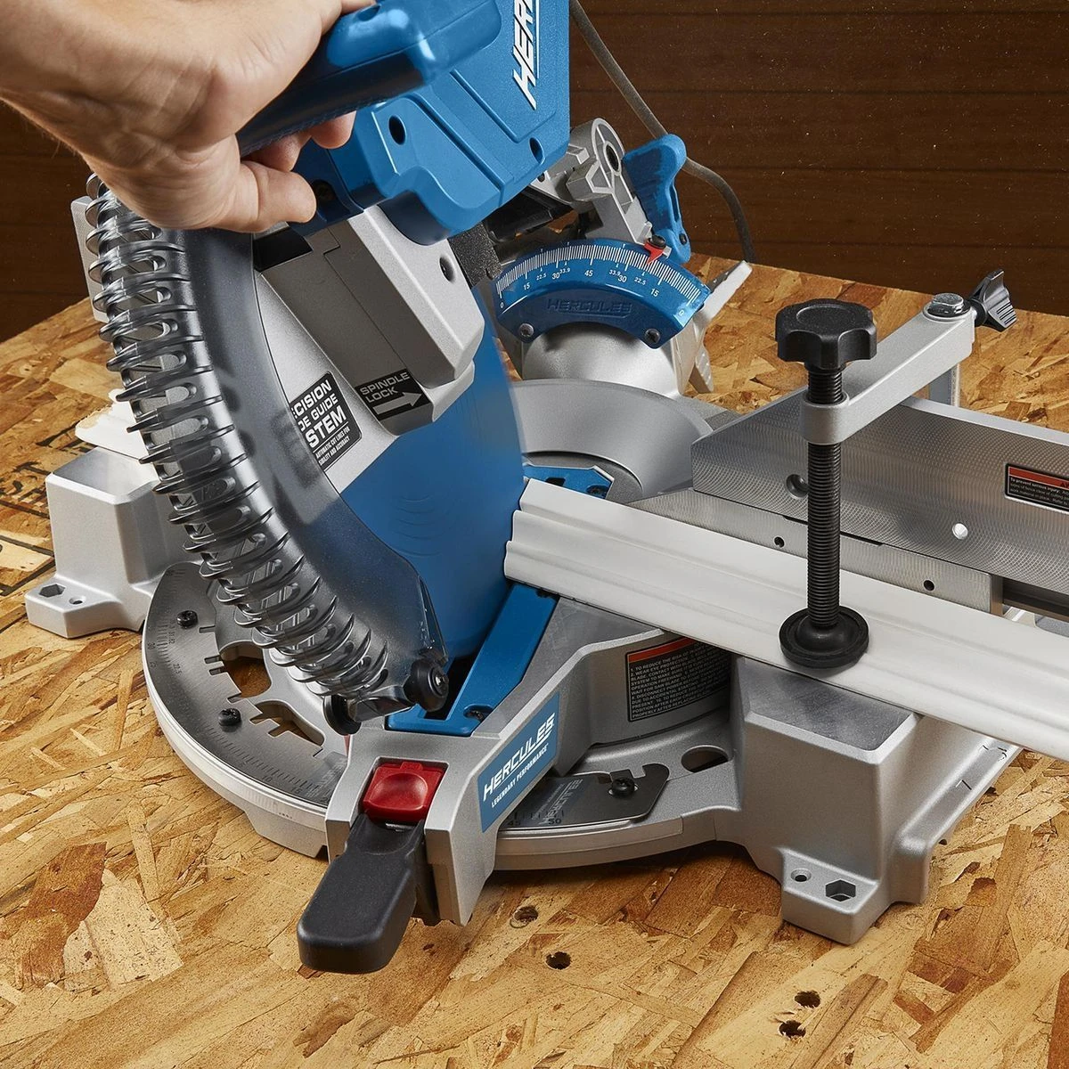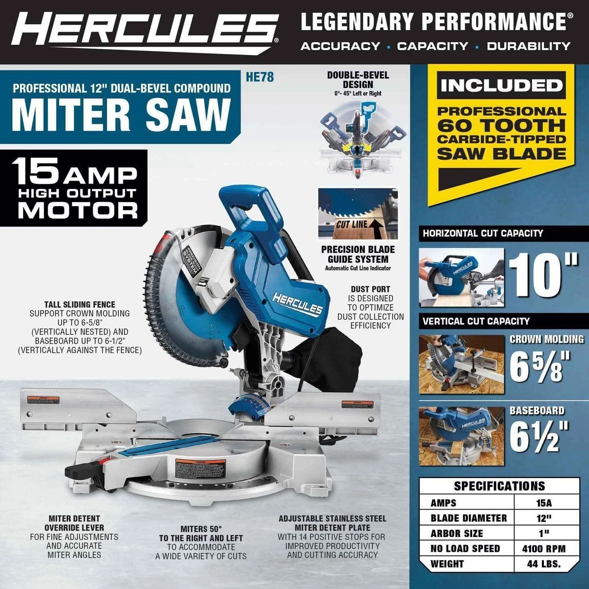 The HERCULESยฎ Professional 12 in. Dual Bevel Compound Miter Saw is designed with a Precision Blade Guide System that uses an LED light shadow for improved visibility resulting in a more accurate cut. The high output 15 AMP, 4100 RPM motor delivers increased power for high performance cutting. Tall sliding fences support crown molding up to 6-5/8 in. (vertically nested) and baseboard up to 6-1/2 in. (vertically against the fence). Includes HERCULESยฎ Ultra Sharp, Long Lasting 12 in. x 60 tooth carbide-tipped saw blade for fast, fine cutting.