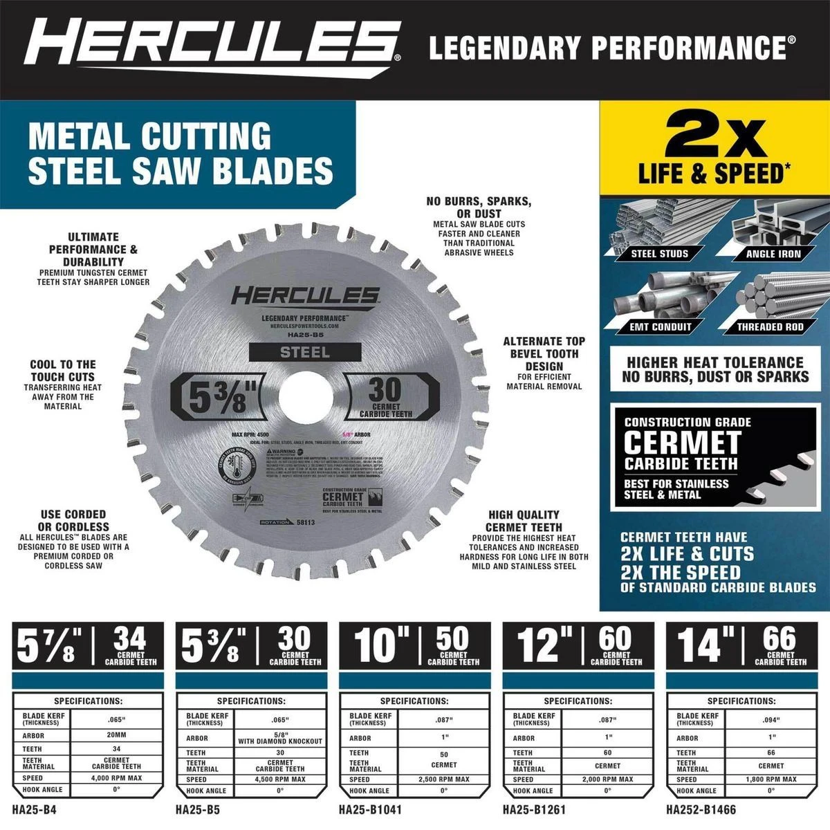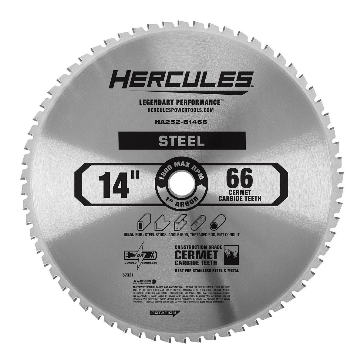 This HERCULESโข 14 in., 66T Cermet Carbide Circular Saw Blade is specially engineered for cutting steel studs, angle iron, threaded rod, EMT conduit. Construction grade cermet carbide teeth deliver the best performance for cutting stainless steel and metal.