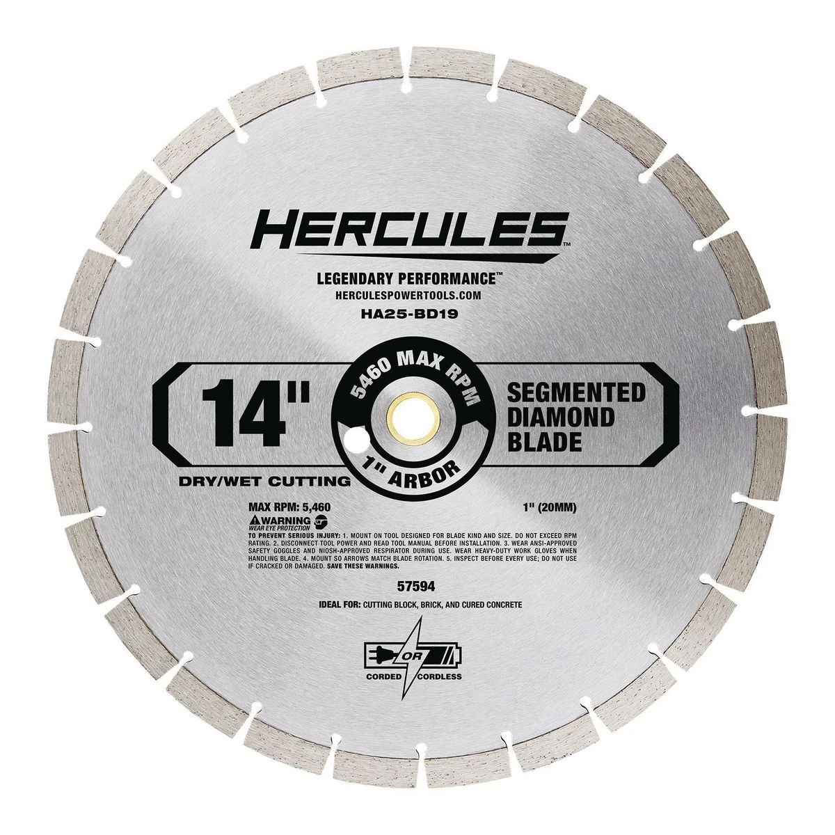 This HERCULESβ’ 14 in. Segmented Diamond Blade is ideal for cutting through the hardest materials including cured concrete, concrete wirebar, brick, block, paver, and stone. The blade is designed for clean, fast cuts with gas power, electric power, and walk-behind saws. The high grade diamond grit and metal bond matrix ensures faster cuts and longer blade life. The blade is ideal for Wet or Dry application.