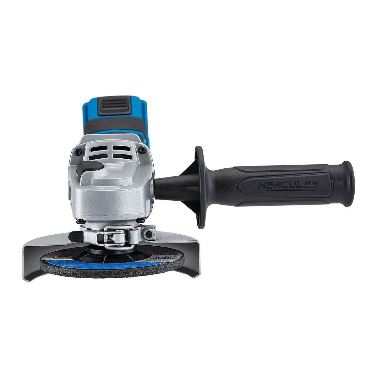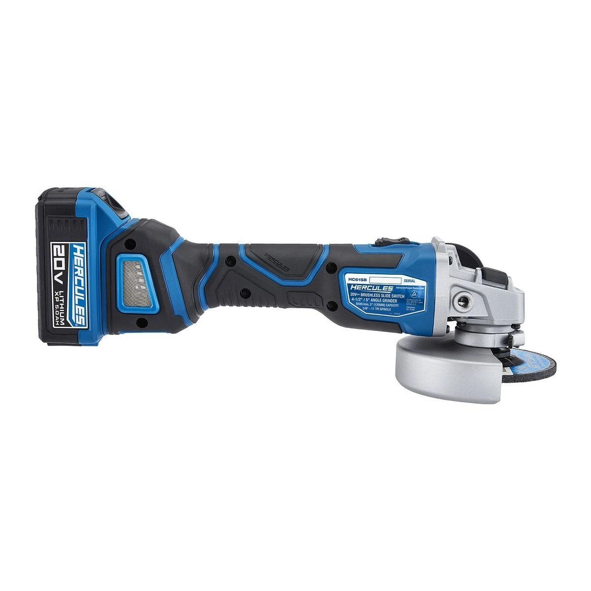 Powered by a high-efficiency brushless motor, the HERCULESยฎ 20V Brushless Cordless Angle Grinder delivers up to 45% more run-time, along with 20% more power*. This grinder maintains constant power in the toughest grinding and cutting applications. The slim, compact and lightweight frame, 2-position side handle, and lock-on switch provide ultimate comfort and control during extended periods of use. All-metal construction ensures maximum durability on the jobsite and in the shop. Powered by the HERCULESยฎ Lithium Battery System, this brushless grinder goes where the job is.
