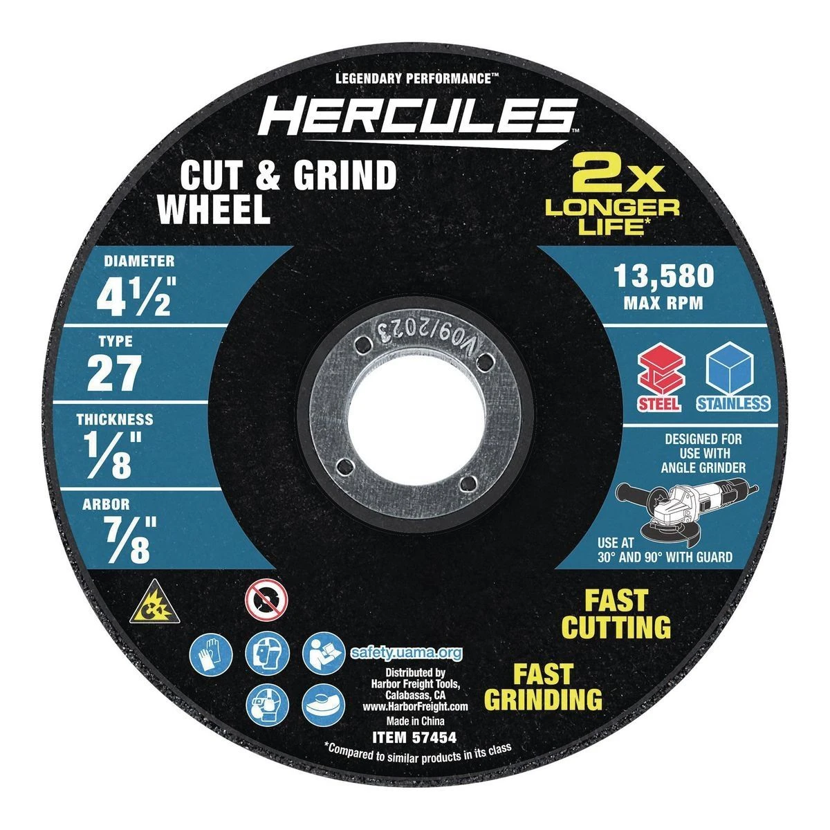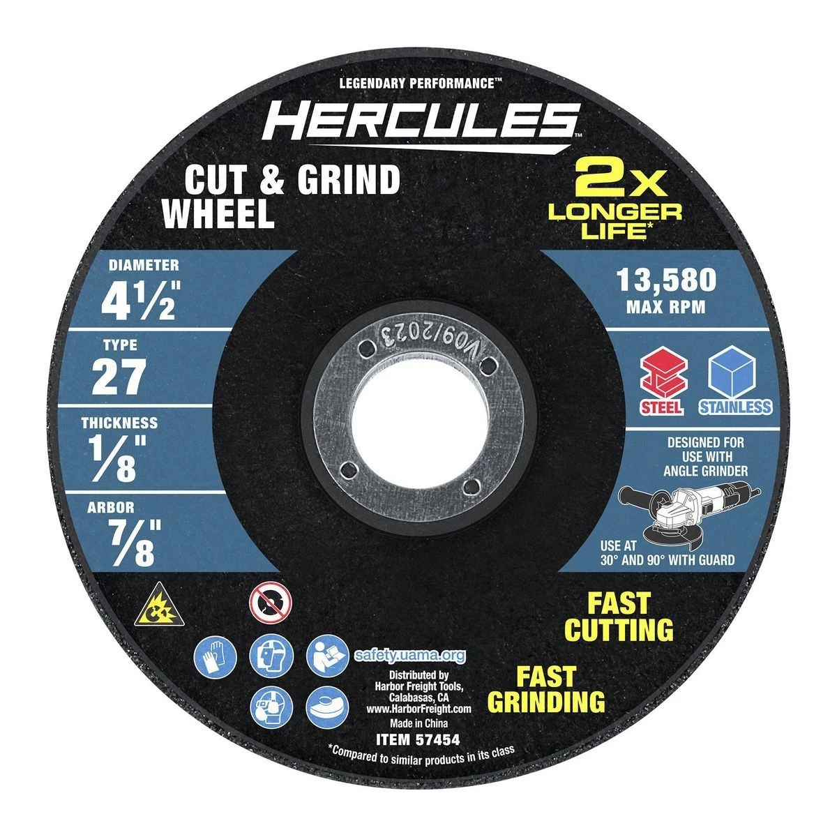 The HERCULESβ’ 4-1/2 in. Cut and Grind Wheel is superior in durability and performance. Ideal for use with a wide variety of metal grinding applications, this wheel uses premium quality abrasive for the toughest applications. Get the best results when cutting, grinding, smoothing, shaping metal, and removing weld slag.